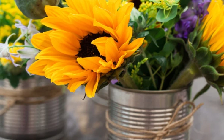 Que tal uma composição com vários vidrinhos ou garrafas que você já tem em casa? Você pode apenas colocar diversas variedades de flores e fazer uma composição bem linda, ou pode decorar os vasinhos com barbante ou tecidos.