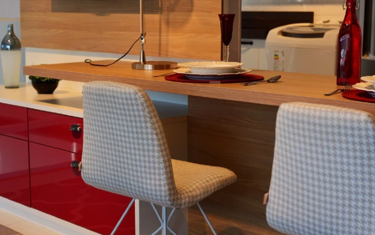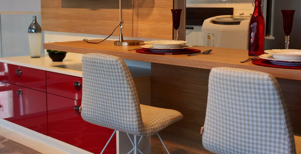 E essa bancada que, além de mesa de jantar, serve como divisor de dois ambientes.
