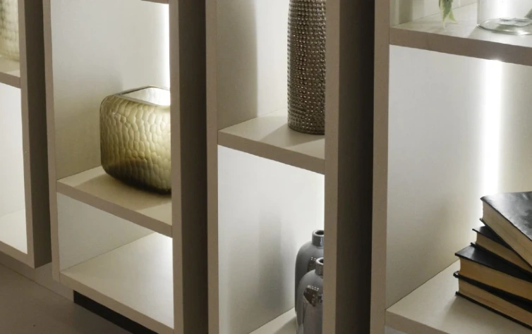 Agora, se você quer um ambiente com mais personalidade e menos formalidade, pode fazer como o exemplo abaixo: nichos com tamanhos diferentes e que utilizam decorações de diversos tamanhos. Esse estilo forma quase um box irregular, possibilitando versatilidade no decor. Essa estrutura abaixo faz parte de um home, projetado pela Italínea.