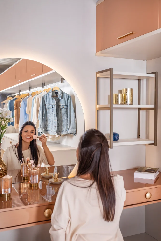 A penteadeira ou bancada para make, em frente ao espelho, é um ponto focal esteticamente agradável, deixando o seu closet com cara de camarim. Você pode se sentir uma estrela de cinema dentro do próprio closet.
