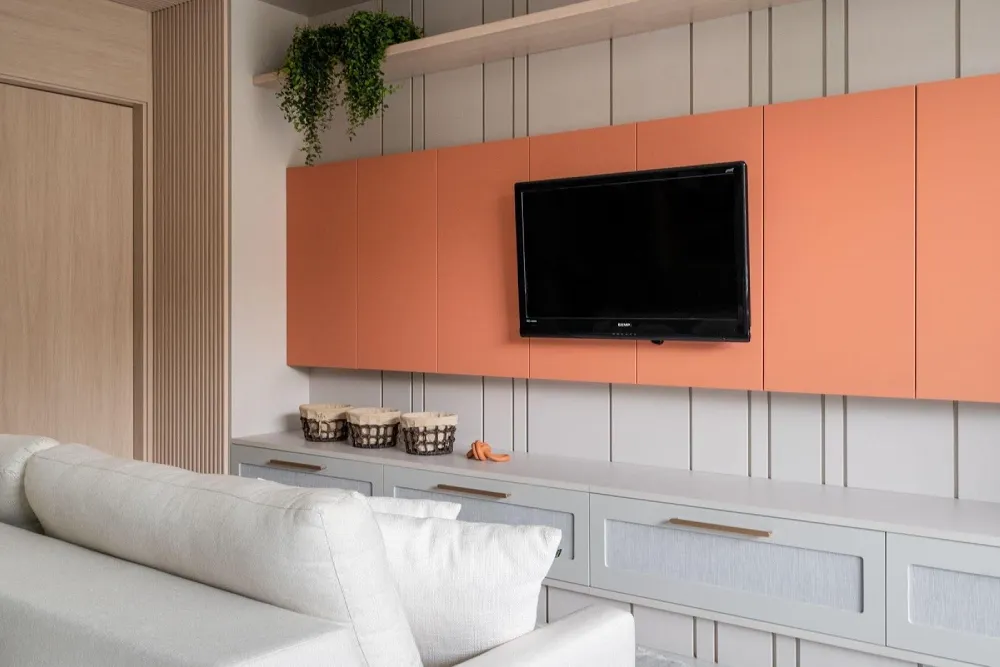 As cores, na decoração, devem ser utilizadas para transmitir harmonia e expressar emoções. Ao incorporar a Peach Fuzz em móveis planejados, certifique-se de equilibrar a paleta de cores. Crie equilíbrio aplicando tons neutros em outros elementos do ambiente, como paredes, pisos ou móveis complementares.