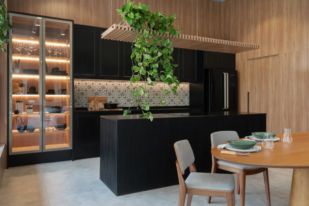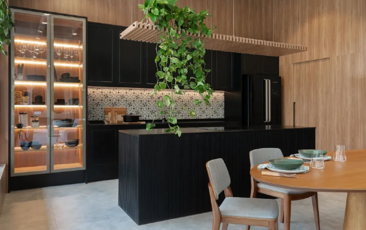Em cozinhas, o revestimento PET é utilizado para criar armários e portas de gabinetes, resultando em superfícies lisas e brilhantes que são resistentes a manchas e fáceis de limpar.